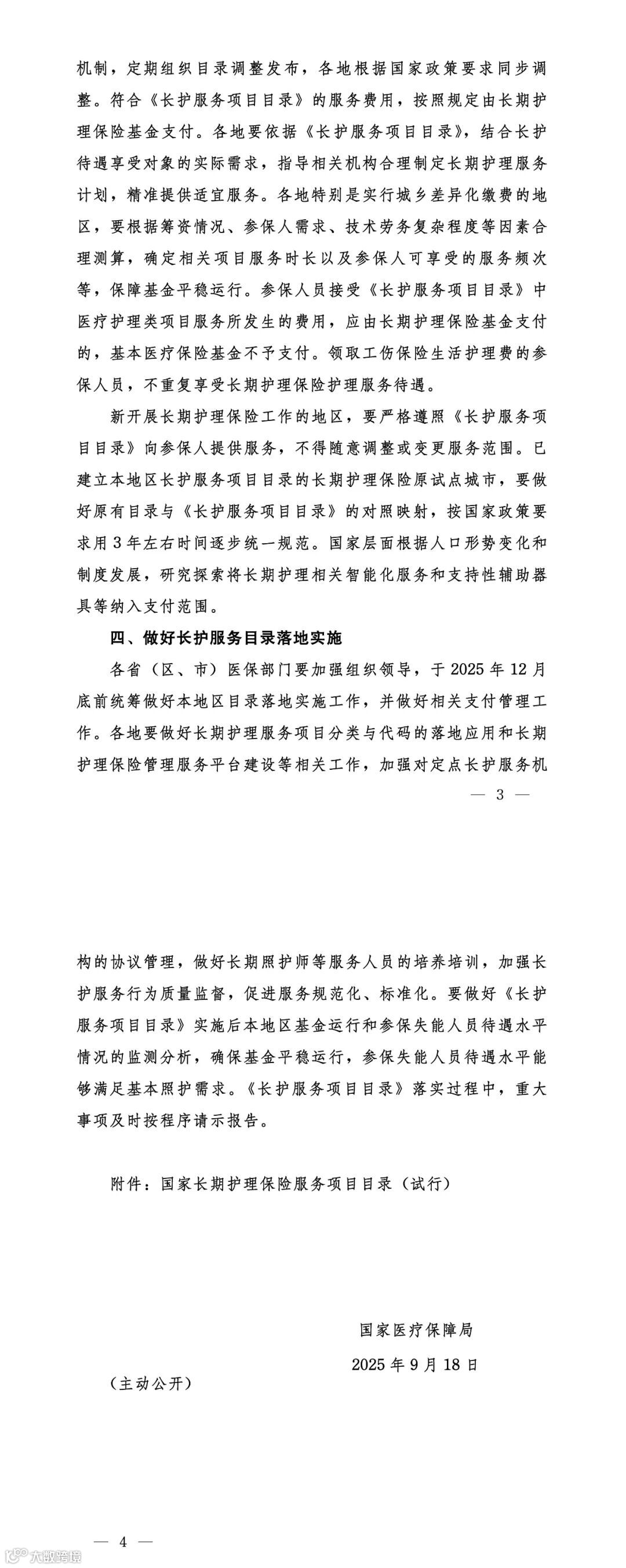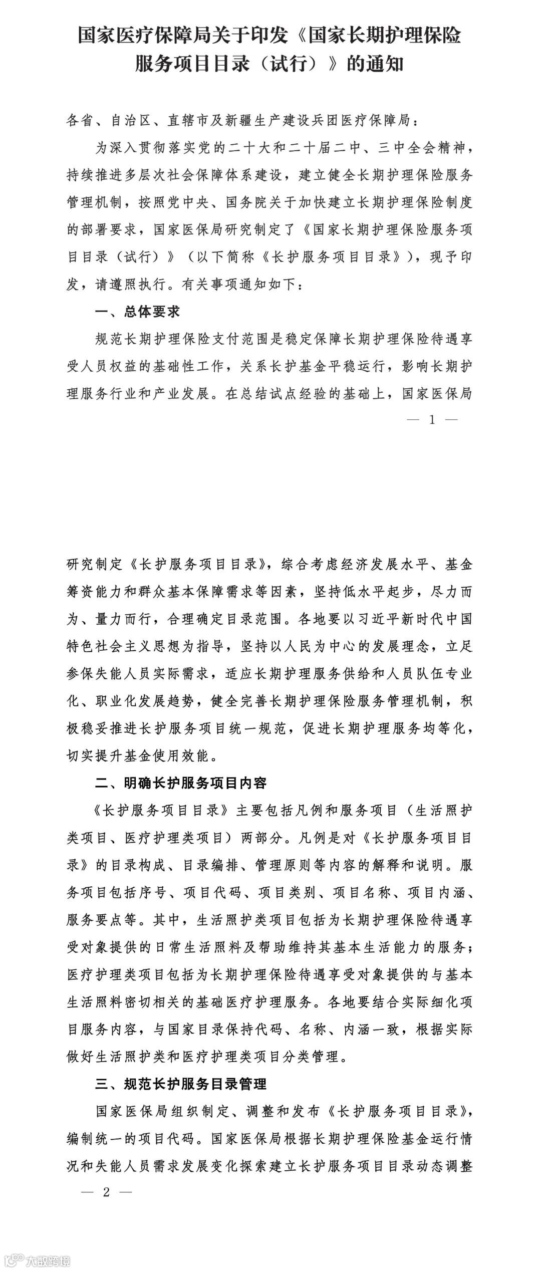 《通知》明确,国家医保局组织制定、调整和发布国家《长护服务项目目录》,编制统一的项目代码,建立动态调整机制,定期组织目录调整发布。新开展长期护理保险工作的地区,要严格遵照《目录》执行,不得随意调整或变更服务范围。已建立本地区长护服务项目目录的试点城市,要做好原有目录与国家《目录》的对照映射,按国家政策要求利用3年左右时间逐步统一规范。