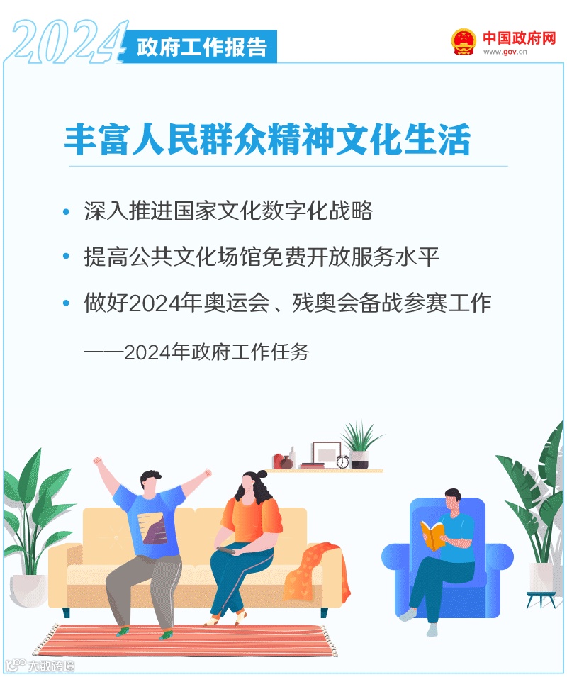 丰富人民群众精神文化生活。深入学习贯彻习近平文化思想。广泛践行社会主义核心价值观。发展哲学社会科学、新闻出版、广播影视、文学艺术和档案等事业。深入推进国家文化数字化战略。深化全民阅读活动。完善网络综合治理,培育积极健康、向上向善的网络文化。创新实施文化惠民工程,提高公共文化场馆免费开放服务水平。大力发展文化产业。开展第四次全国文物普查,加强文物系统性保护和合理利用。推进非物质文化遗产保护传承。深化中外人文交流,提高国际传播能力。加大体育改革力度。做好2024年奥运会、残奥会备战参赛工作。建好用好群众身边的体育设施,推动全民健身活动广泛开展。