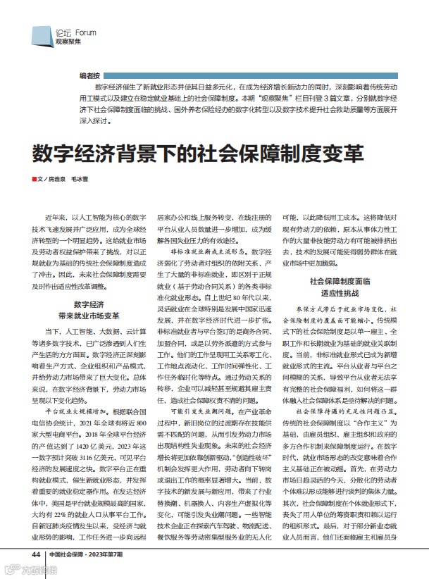 近年来,以人工智能为核心的数字技术飞速发展并广泛应用,成为全球经济转型的一个明显趋势。这给就业市场及劳动者权益保护带来了挑战,对以正规就业为基础的传统社会保障制度造成了冲击。因此,未来社会保障制度需要及时作出适应性改革调整。