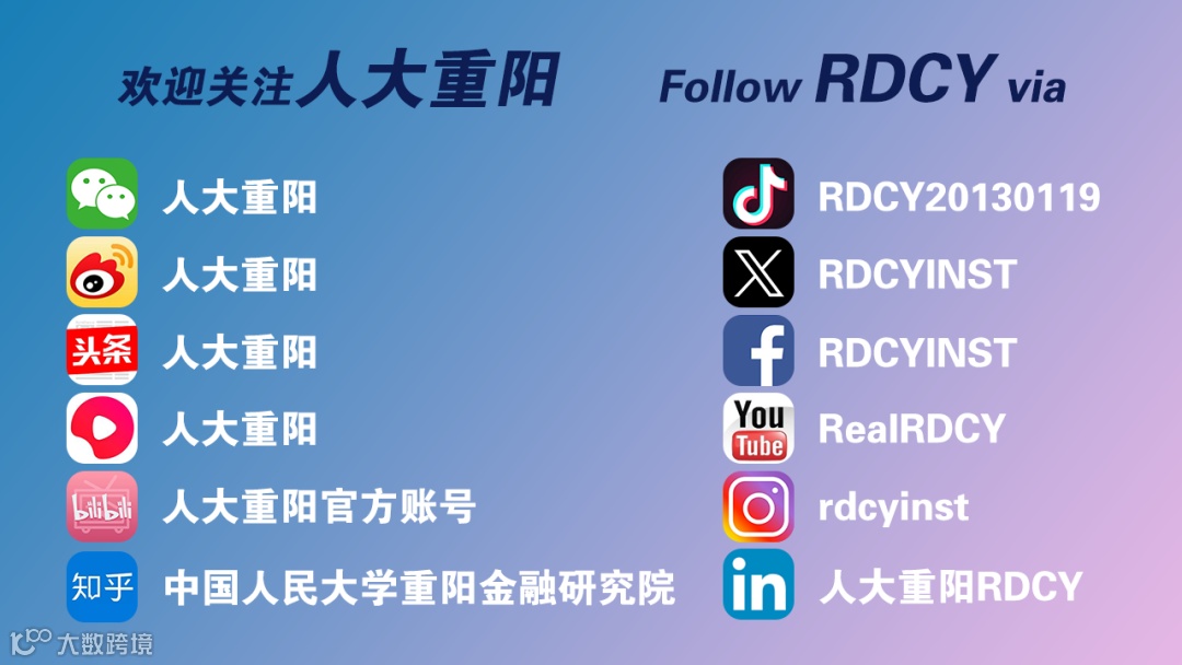 作为中国特色新型智库,人大重阳聘请了全球数十位前政要、银行家、知名学者为高级研究员,旨在关注现实、建言国家、服务人民。目前,人大重阳下设7个部门、运营管理4个中心(生态金融研究中心、全球治理研究中心、中美人文交流研究中心、中俄人文交流研究中心)。近年来,人大重阳在金融发展、全球治理、大国关系、宏观政策等研究领域在国内外均具有较高认可度。