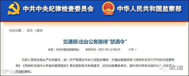 中央纪委监察部网站9月22日消息,为深入贯彻全面从严治党要求,进一步严格落实中央八项规定精神,交通运输部按照《党政机关厉行节约反对浪费条例》《党政机关国内公务接待管理规定》等法规和有关制度要求,近日向部属各单位、部内各司局发出国内公务接待禁止饮酒的通知。