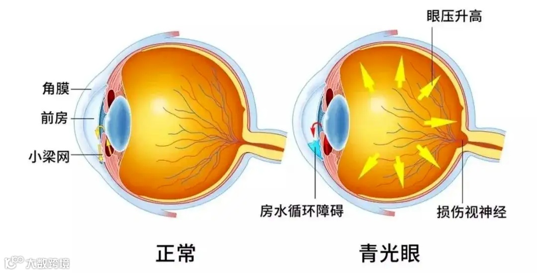 眼压正常值平均范围为11~21mmHg,眼压升高会压迫并损伤眼底视神经,未经治疗或管理不善的青光眼可导致永久性和不可逆的视力丧失。