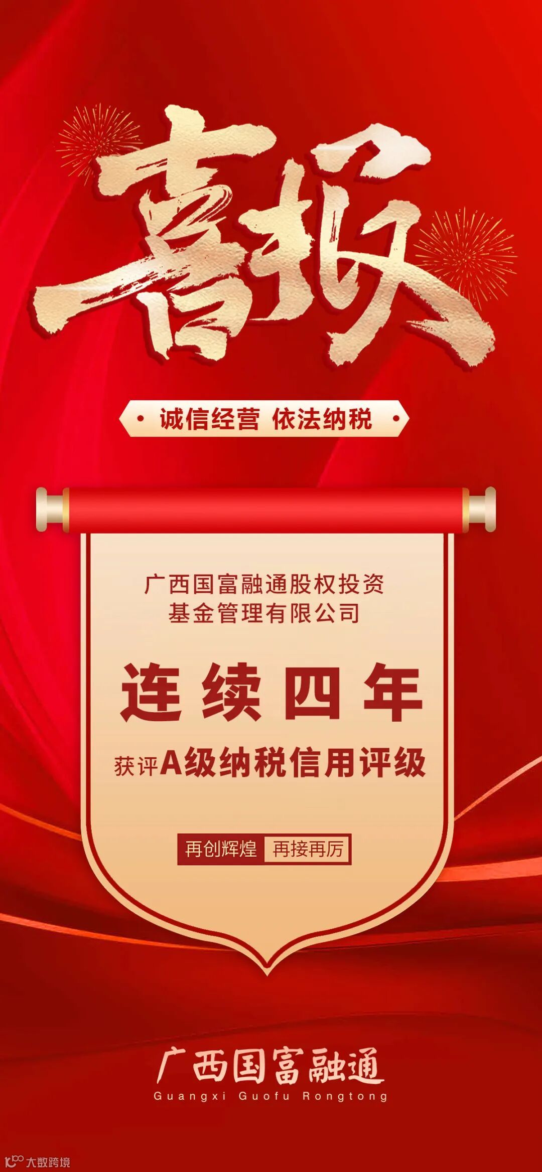 近日,国家税务总局网站公布了2023年全国纳税信用评级A级纳税企业名单,其中,国富融通获得2023年纳税信用等级最高评级——A级,这是国富融通连续四年获此评级。“A级纳税人”荣誉称号是税务机关对国富融通诚信纳税、守法经营的肯定和表彰,是国富融通严格遵守税收法律、行政法规的有力体现。此次获评将进一步提升国富融通的社会形象和美誉度,也为公司增信、评优等工作打下了良好基础。在今后的发展中,国富融通将继续筑牢守法经营、依法纳税的经营理念,不断提升财税管理水平,为公司长远健康发展积蓄力量!