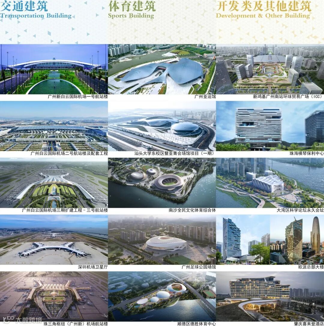 ADG·机场院团队长期致力于交通建筑、体育建筑等大型复杂公共建筑的实践,设计了中国三大航空枢纽之一的广州白云机场、大湾区的深圳宝安机场和珠三角枢纽机场等华南地区主要机场航站楼,以及广州亚运馆、汕头亚青会场馆、南沙全民文化体育综合体、广州足球公园场馆等体育建筑,并开展了一系列深度研究;此外团队同步开展了TOD开发、文化、会展及其他建筑类型的实践,项目累计超200万平方米。
