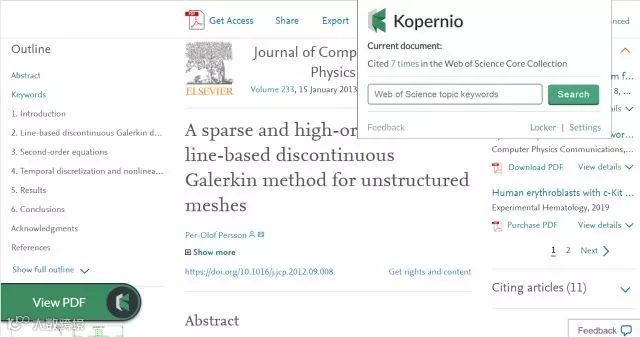 Kopernio目前与Web of Science,PubMed,Google Scholar以及20000家其他网站资源相整合。使用十分简单,只需将插件安装好后,搜索文献,即可在PubMed、Google Scholar显示View PDF,点击后可跳转到全文PDF界面。