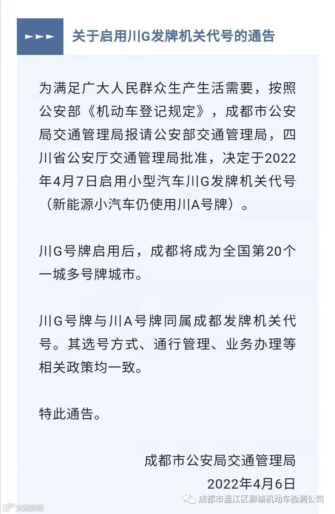 导读:温江柳城检测站发布最新通告川G牌照正式启用了!