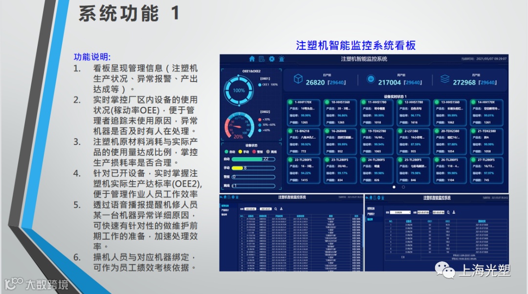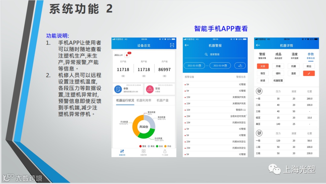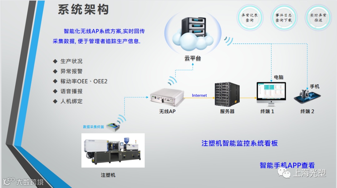 近日,上海光塑机械联合上海阿波格智能共同推出注塑机智能联网系统,该系统可以帮助客户随时随地查看设备运行状况,节省信息反馈时间;减少人工监管成本以及潜在的出错成本;提高企业生产效率,让订单交付更及时;提高企业管理效率,优化管理流程,助力客户更好地实现信息化智能化管理。