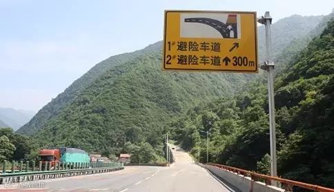 2、避险车道提示牌:这指示牌是在下坡较多地区常见,是为了预防刹车失灵而修的车道,看到此指示牌的前方会有一段45度斜坡,这段路就是避险车道。