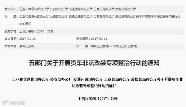 其次,1月中旬从工信部网站获悉,为了加大对货车非法改装行为的打击力度,着力从源头预防和遏制货车违法超限超载行为,工业和信息化部、公安部、交通运输部、工商总局、质检总局联合下发了《关于开展货车非法改装专项整治行动的通知》决定在全国范围内开展货车非法改装专项整治行动。