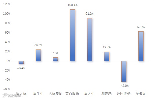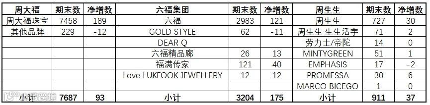 周大福方面,中国内地零售门店76.9%为加盟形式,已提前两年完成开设7,000间门店的目标,成为了国内规模领先的珠宝上市企业。