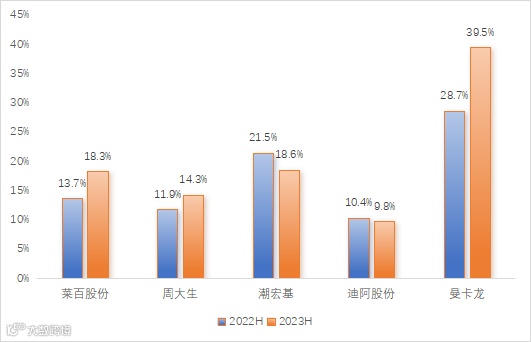 2023年上半年,菜百股份、周大生、曼卡龙等上市公司线上销售额增幅均超过6成,潮宏基线上销售额增幅超过2成,显示出行业的数字化进程仍在深化。