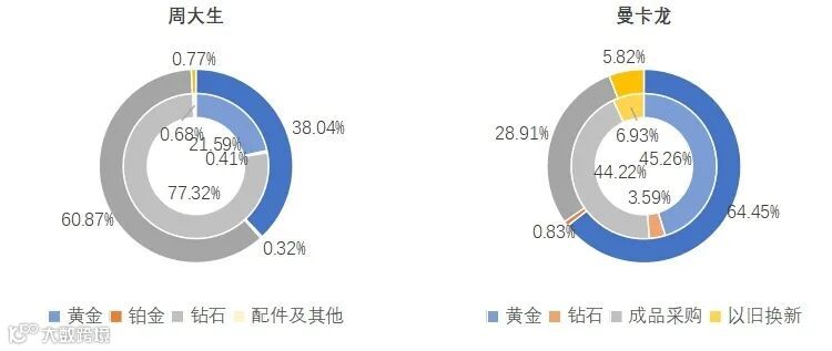 图13 2022年上半年-2023年上半年周大生、曼卡龙产品结构占比(注:内圈为2022H,外圈为2023H)