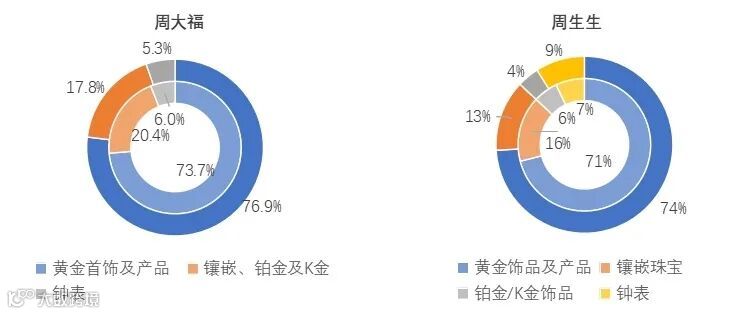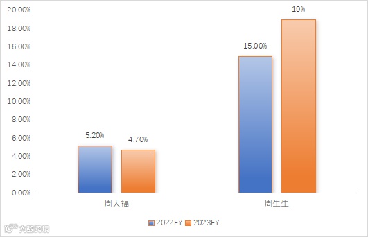 图14 2022财年-2023财年周大幅、周生生产品结构占比(注:内圈为2022财年,外圈为2023财年)