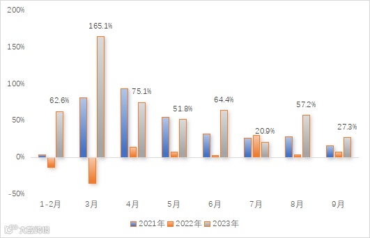 图9 2021年-2023年1月-9月香港特区珠宝首饰、钟表及名贵礼物销货价值变动比率