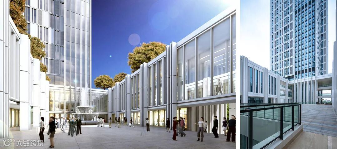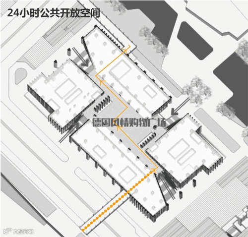 设计采用共享平台理念,二层设置24小时公共开放空间,并通过四面大台阶、天桥连廊与相邻地块相连。使得二层平台聚集周边大量人气,打造具有欢快生活味道的德国风情商业街区。