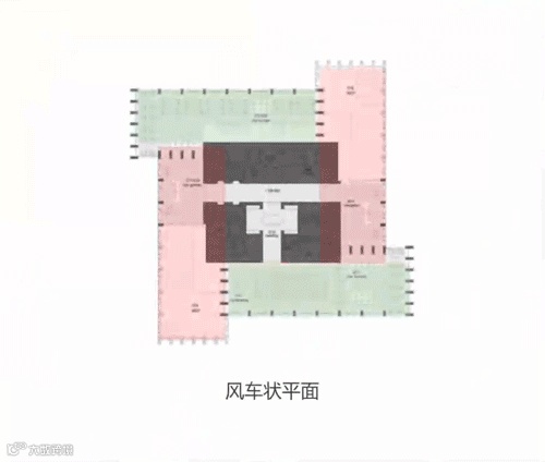 宗德服务中心每幢塔楼都是由四个围绕核心的框状体块构筑而成,平面呈现风车形态,寓意着“风生水起”,使其成为特征鲜明的地标性建筑。其中B区项目两栋超高层公寓塔楼相错设置在裙楼的南北两端,相互呼应,浑然一体。