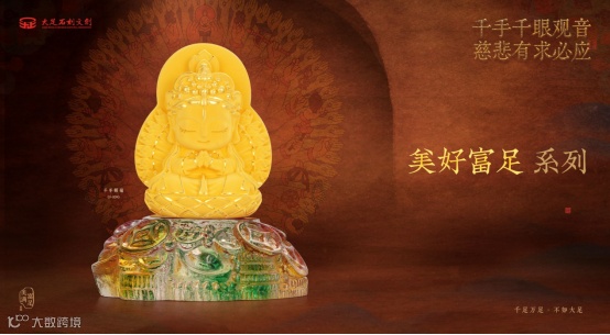 “大足金”系列以“大丰大足,美好人生”为理念,提取“知足、富足、满足”人生三大足作为产品主题,撷取千手观音、卧佛、莲花等大足石刻经典吉祥图案和祈福元素,将石刻艺术背后的智慧与祝福融入到时尚金饰当中,带来全新消费体验,点亮美好生活。