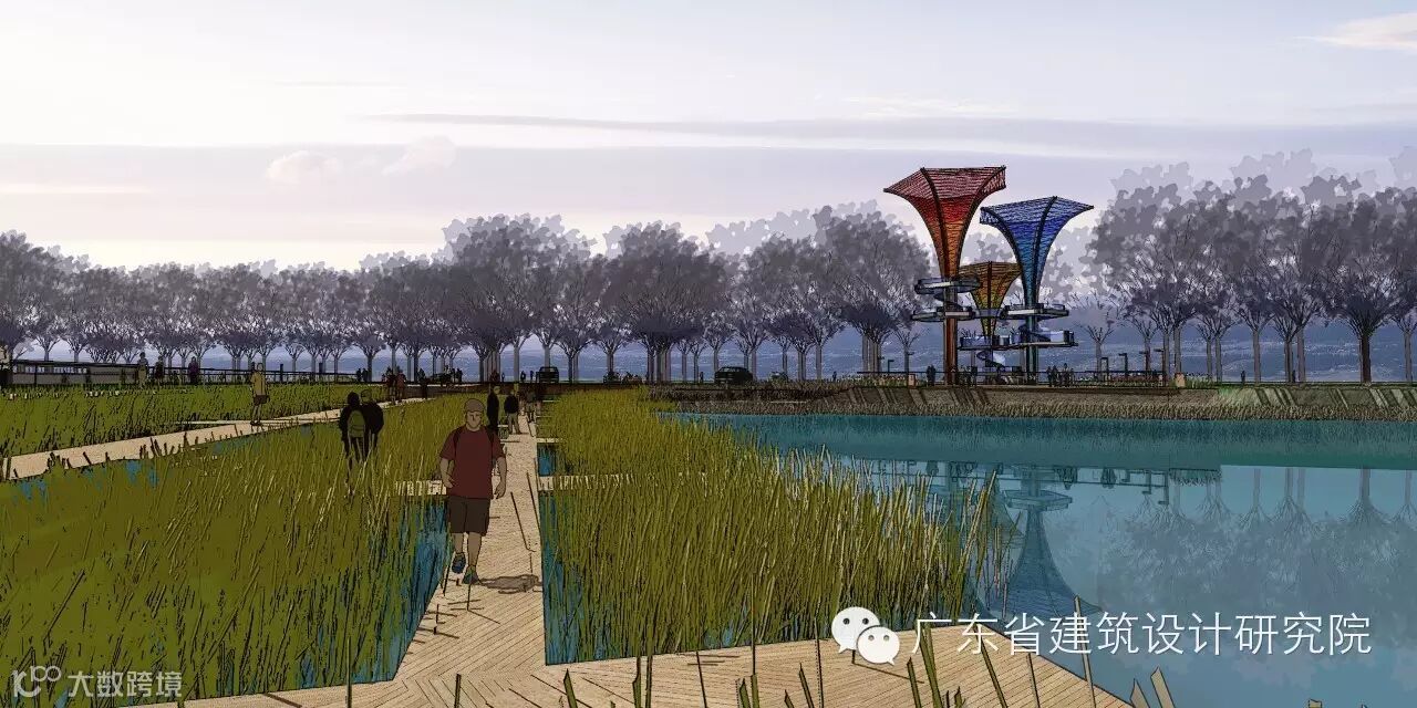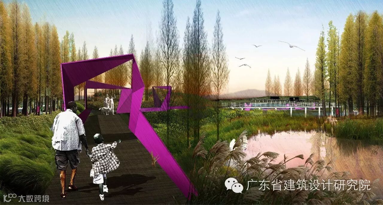 (1)核心区宽广的湖面和环湖的自行车道为特色,围绕新塘水库组织景观结构和游览路线;通过在北侧的华彩广场设置服务中心,组织疏散人群形成主要的休闲与游憩场所。