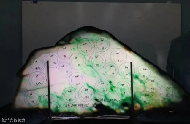 图. 翡翠板料:从翡翠原石上切下来的一整片,并在板上画好手镯位,供买家自由选择