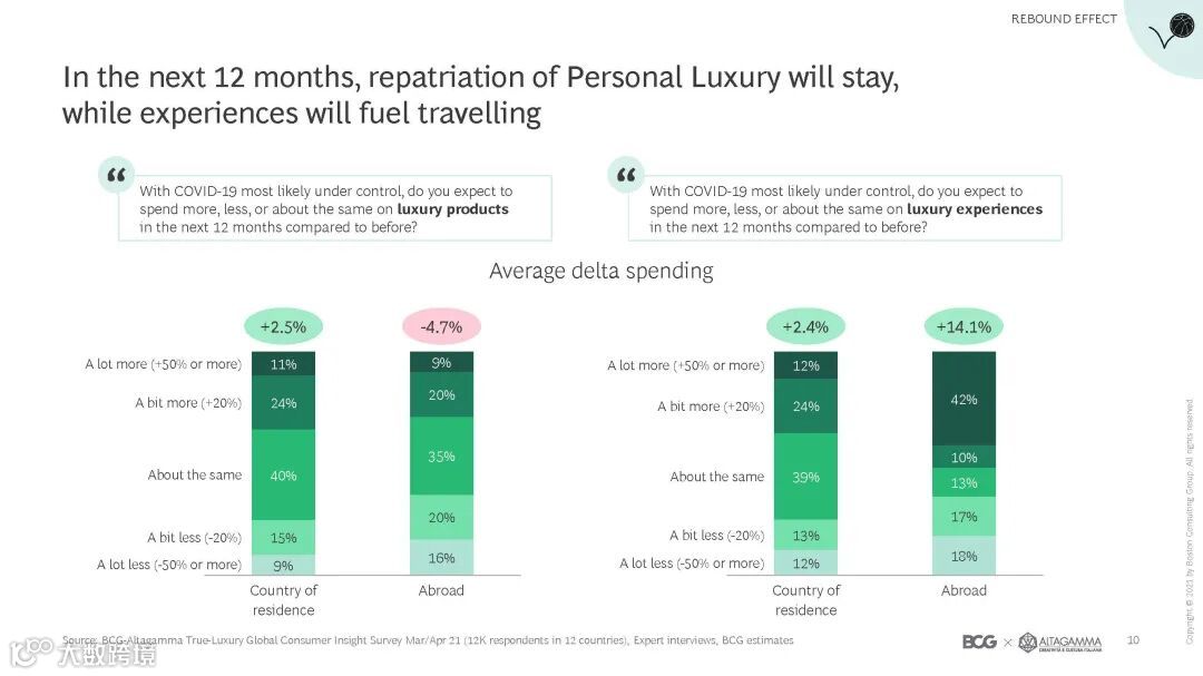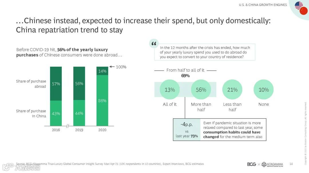 ② 中国和美国的消费者均表示将进一步增加奢侈品消费支出,但中国消费者倾向于在本土增加相关消费。