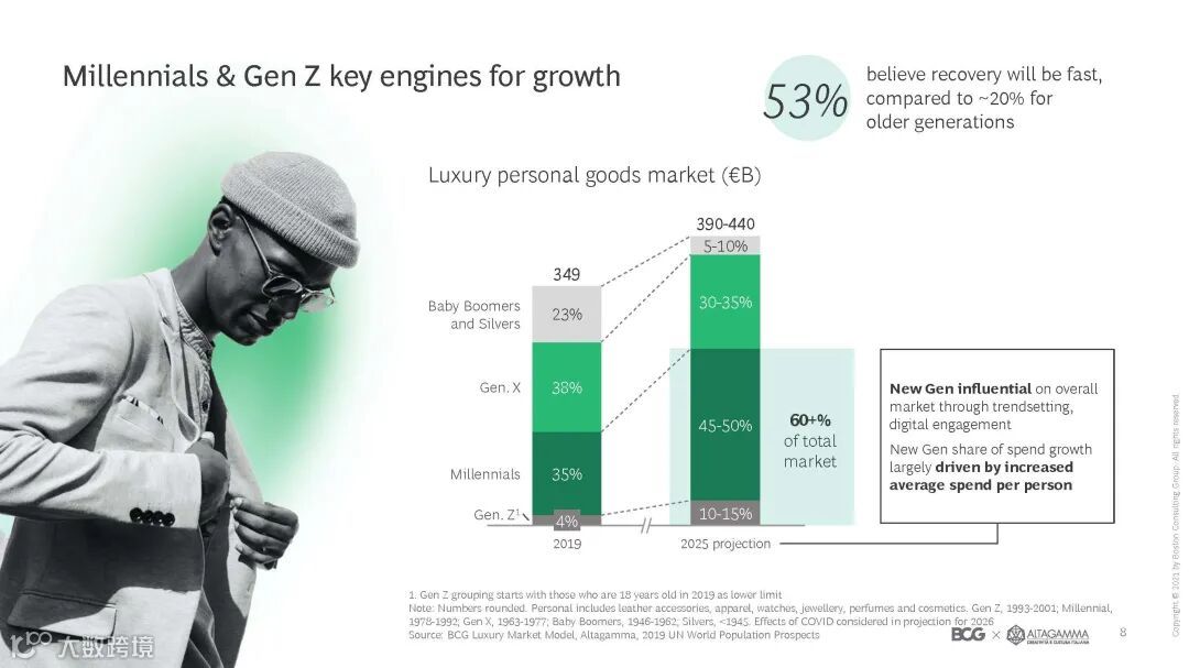 调查显示:相比而言,年轻一代对奢侈品市场在疫情后的恢复情况持更加乐观的态度,并且年轻一代对奢侈品市场的贡献也越来越突出,预计到2025年,千禧一代和Z世代的奢侈品消费会占到60%以上的市场份额。