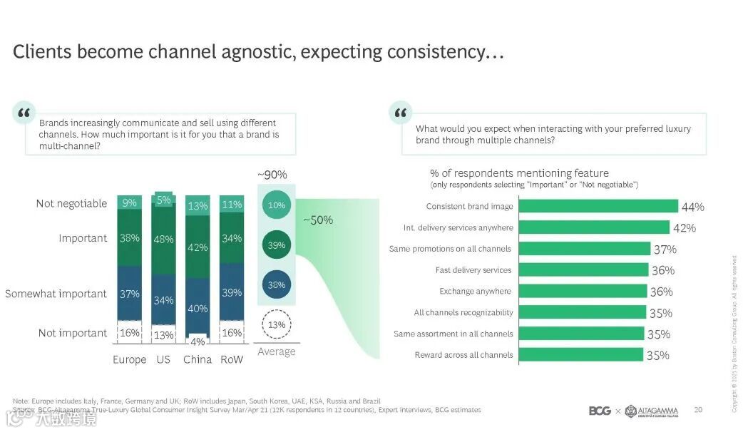 调查显示,绝大多数受访者都认为奢侈品品牌有必要构建多重渠道进行营销,可见跨渠道消费已成为一项越来越重要的趋势。消费者期待在不同渠道接触品牌时能获得一致性的服务和观感(包括品牌形象和促销活动等),并希望个体诉求能得到品牌有针对性的回应。