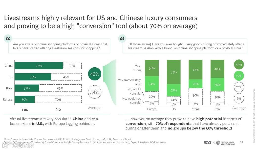 直播带货不仅在中国和美国的奢侈品消费者中占据极重要的地位,在其他国家地区也都被证明具有平均70%的高转化率。