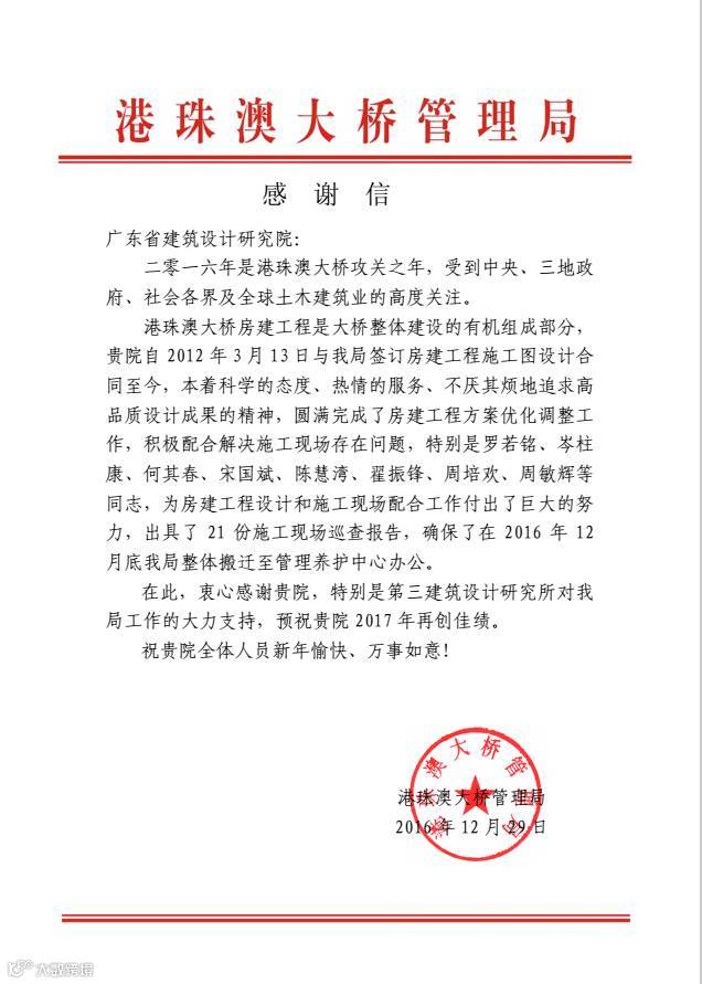 近日,由GDAD第三建筑设计研究所领衔的港珠澳大桥房建工程(管理养护中心)项目组得到业主方的高度认可和书面表扬。