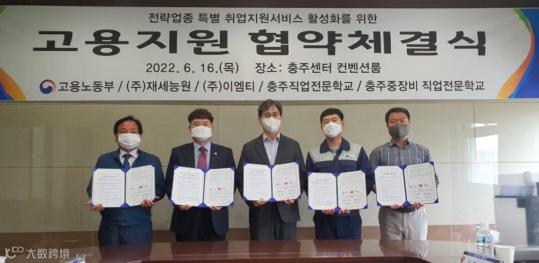 2022年6月16日当地时间15:00(株)EMT应韩国雇佣劳动部忠州支厅忠州雇佣中心邀请与忠州职业专门学校,忠州重装备职业专门学校签订了战略业种特别就业支援服务协议。