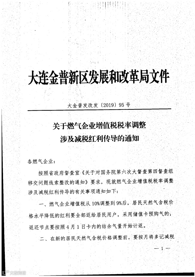 根据国家督查组“关于燃气企业增值税税率调整涉及减税红利传导”的要求和大金普发改发(2019)95号文件《关于燃气企业增值税税率调整涉及减税红利传导的通知》(文件详情见文末)
