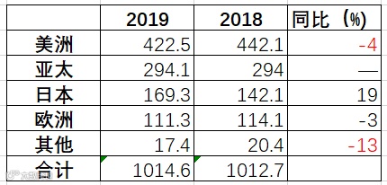 2019年三季度Tiffany各地区总销售额及同比变化(单位:百万美元)
