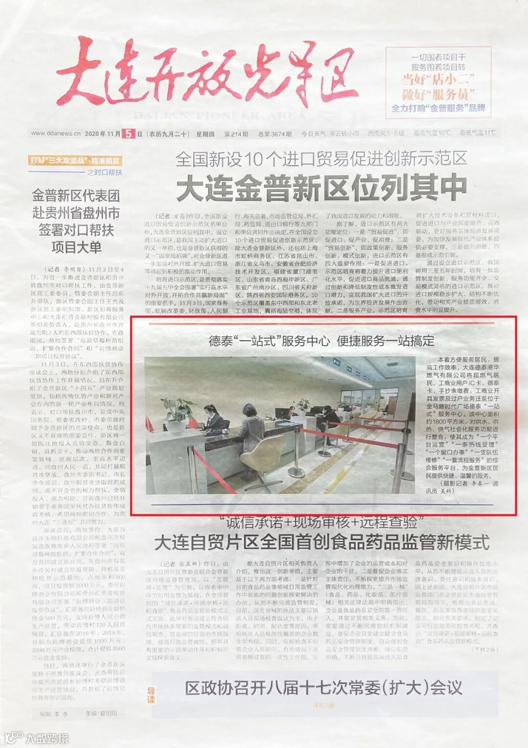 大连开放先导区报于2020年11月5日第214期头版发布了“德泰一站式服务中心 便捷服务一站搞定”的宣传专栏,介绍了燃气业务搬迁状态及德泰“一站式”服务中心构成,公司希望借此让更多新区用户了解燃气相关业务搬迁事宜。