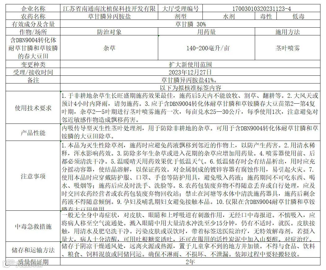 2024年3月29日,南通江山草甘膦产品在生物育种作物上使用的登记证获得首批公示。