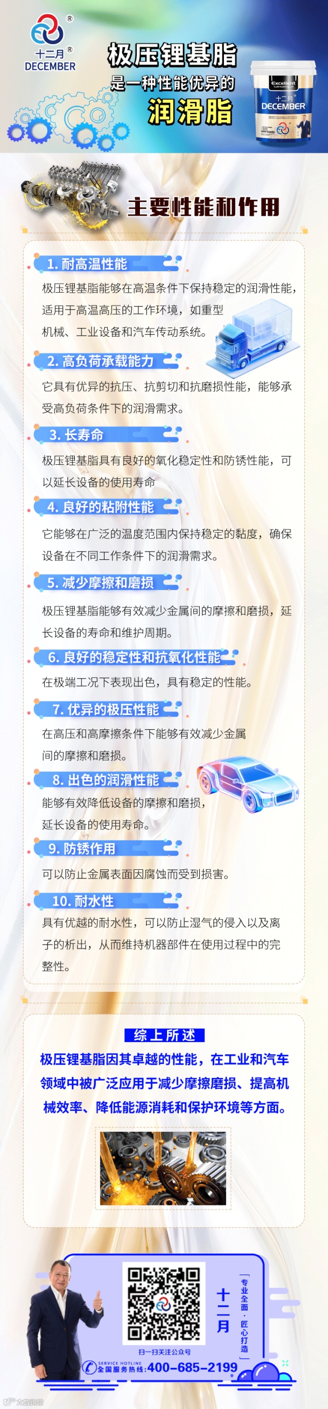 它以锂皂为稠化剂,并添加了极压添加剂,这些添加剂能够使润滑脂在高负荷、高压力的极端工况下,依然可以在金属表面形成有效的润滑保护膜。