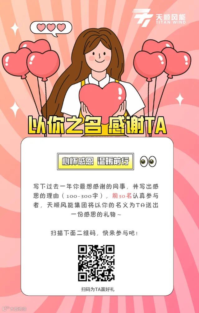 写下过去一年你最想感谢的同事,并写出感恩的理由(100-300字),前30名认真参与者,天顺风能集团将以你的名义为TA送出一份感恩的礼物。