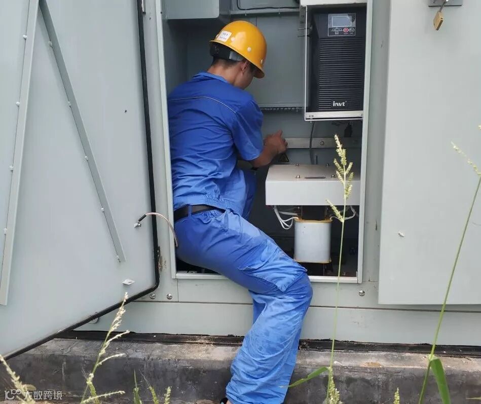 被汗水湿透工装的生产人员在检查箱式变压器