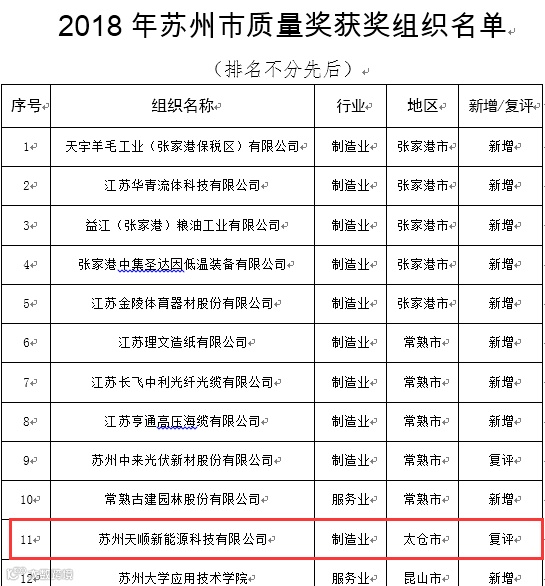 2018年9月,苏州市质量奖评定委员会公布了2018年苏州市质量奖获奖单位。苏州天顺新能源科技有限公司是太仓市唯一一家荣获“2018年苏州市质量奖”殊荣的企业。