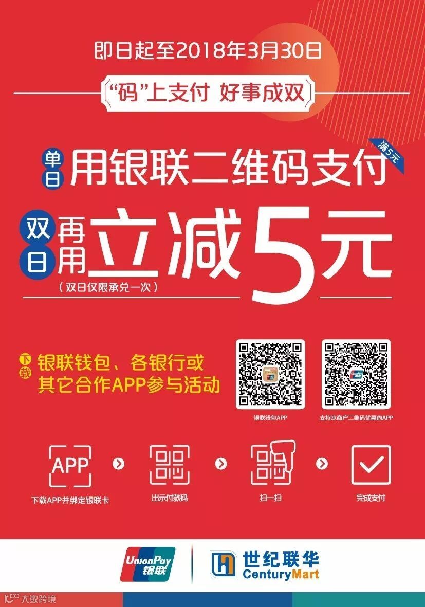 用户双数日(指双数日期,如每月2日,4日,6日)到世纪联华活动门店,使用银联钱包及指定APP的银联二维码,可享受立减5元的优惠。若实际支付金额不超过5元,则可全额减免(仍需支付0.01元用于记账处理)。