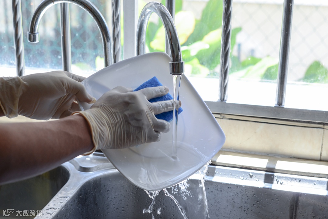 3.用自来水冲去餐用具表面残留的洗涤剂。