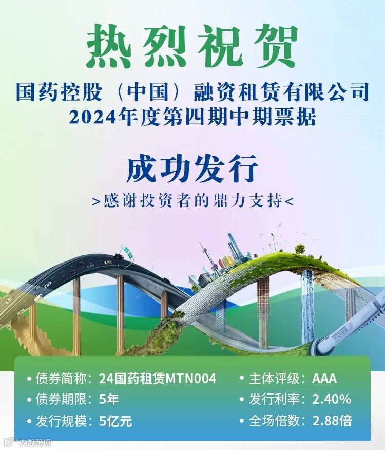 本期债券发行规模5亿元,发行期限5年,发行利率2.40%,全场倍数为2.88倍,体现国控租赁的稳健经营及资本市场对公司资质的认可。