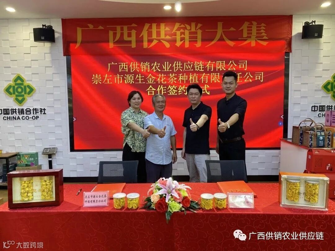 6月15日上午,广西供销农业供应链有限公司与崇左市源生金花茶种植有限责任公司正式签订品牌联名合作协议。广西供销农业供应链有限公司运营部负责人曾志超与崇左市源生金花茶种植有限责任公司董事长曹道明分别代表双方签约。