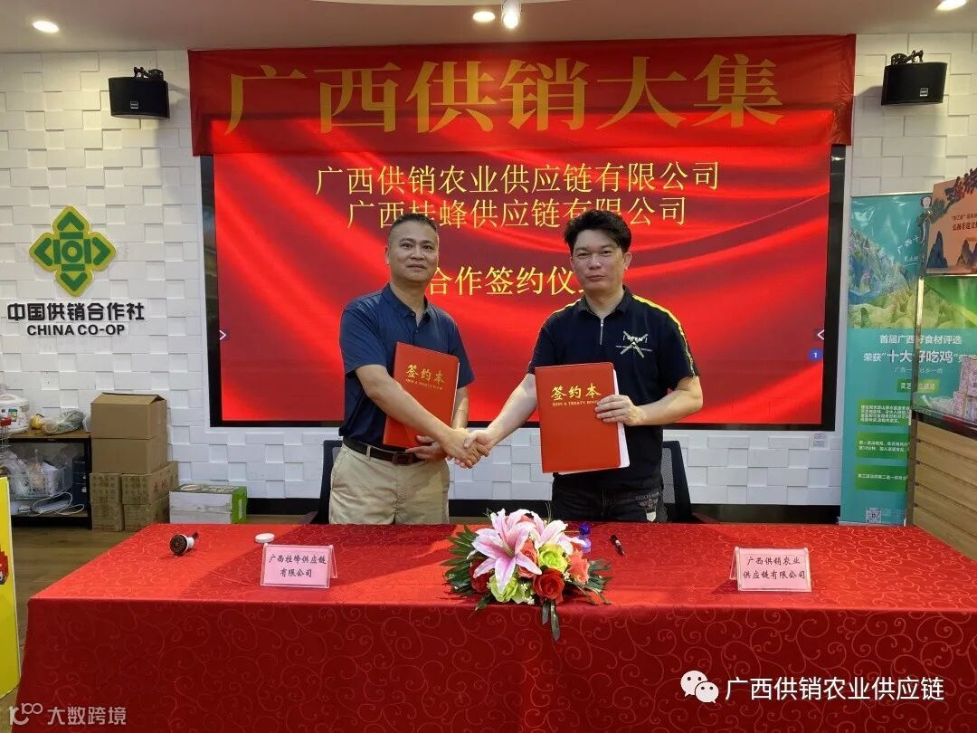 5月31日上午,广西供销农业供应链有限公司与广西桂蜂供应链有限公司正式签订品牌联名合作协议。广西供销农业供应链有限公司运营部负责人曾志超与广西桂蜂供应链有限公司总经理黄仕煜分别代表双方签约。