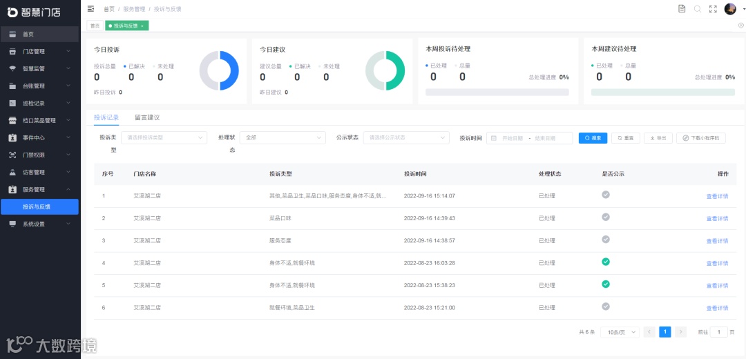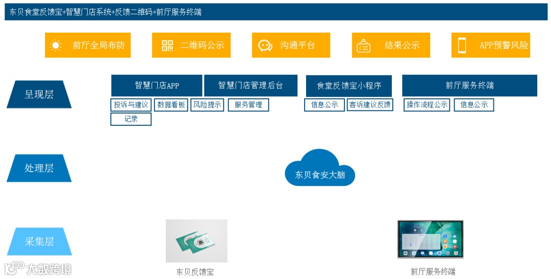 东贝食安前厅服务客诉交互系统解决方案,采用智慧前厅服务系统搭载智慧门店APP、反馈宝小程序组成,系统功能包含:客诉采集管理、平台公示管理、记录统计管理。