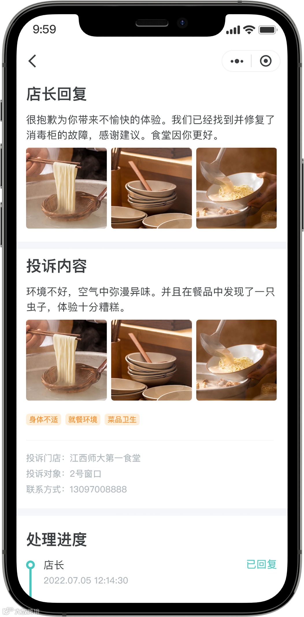 平台公示管理支持消费者的打分与评价实时汇总,食堂门店可根据评价进行改善,支持可选择评论公示展现,对于已处理完毕客诉、及建议信息,可进行多端口处理结果展示。
