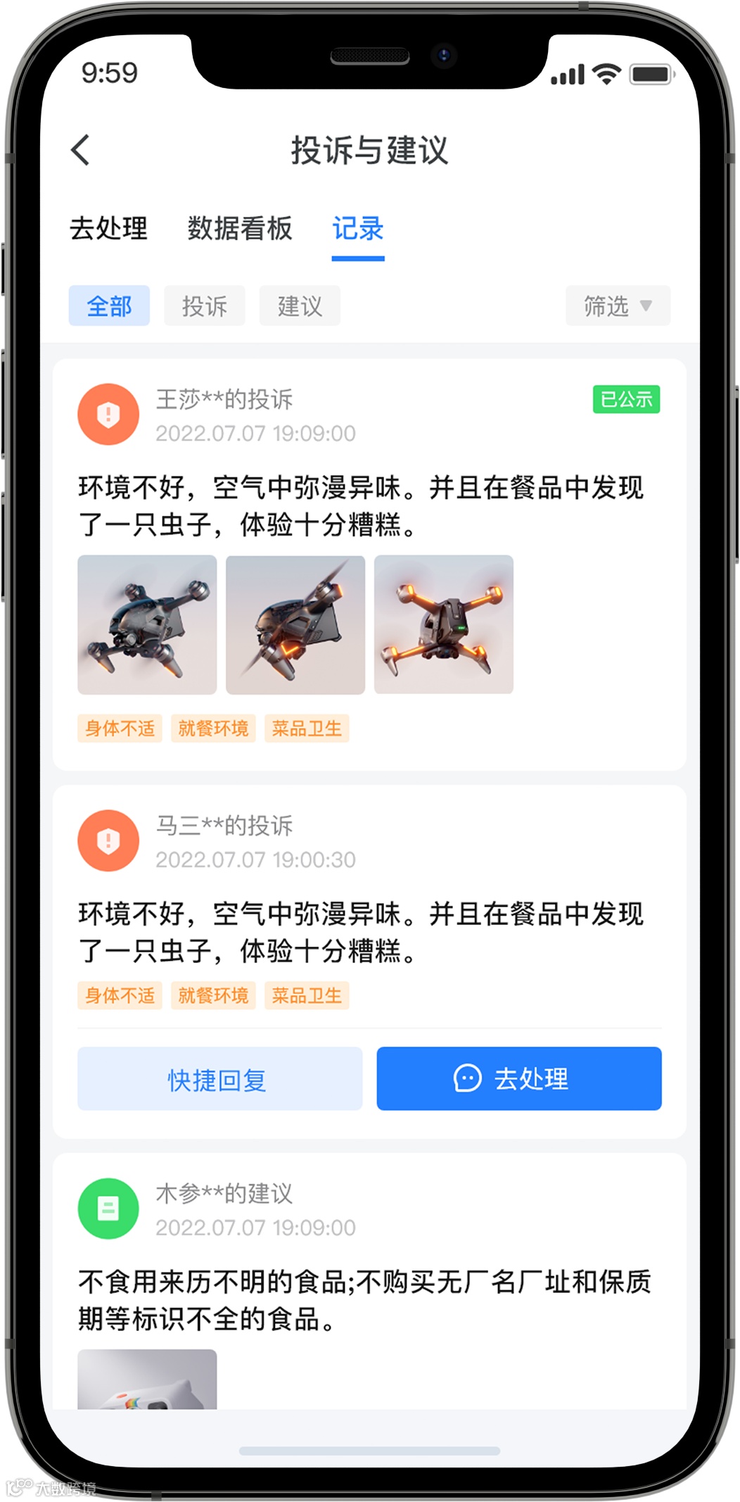 记录统计管理支持客诉处理信息化,食堂门店收到消费者反馈的问题后,门店管理者可在反馈宝后台进行快捷回复处理,并自动统计生成数据看板,相对于传统手工流转的投诉处理流程,东贝系统化可直观查看门店客诉情况,针对数据情况高速高效处理,并保留问题处理的全流程,科学智能地管理门店客诉。