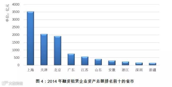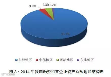 分区域看,截至2014年底,东、中、西部地区和东北地区融资租赁企业资产总额分别占全国比重为90.7%、3.8%、4.3%和1.2%。