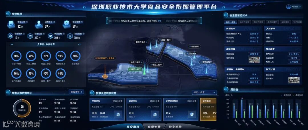 其中,针对传统食堂痛点难点问题,深圳职业技术大学食堂与东贝食安团队展开全面合作,进行了食堂升级改造,推进建设智慧后勤指挥中心,充分运用物联网、AI智能等技术,提升原料溯源把关、设施设备管控、人员行为纠偏等智能化水平,实现了“可视化监管、智慧化识别、流程化管控、数据化呈现、专业化解决”等智慧监管功能,初步构建了“全员、全过程、全方位、全天候、全周期”监管体系。
