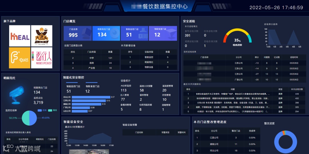 督贝督导食安管控平台食安集控驾驶舱,是汇集门店概览、明厨亮灶、安全巡检、阳光公示等业务场景,实现门店食安态势“一屏全览”,同时具备风险评估、智能预警、跨部门实时联动等功能,可对企业门店的实时集中管控,科学智能地规范门店每一项流程。