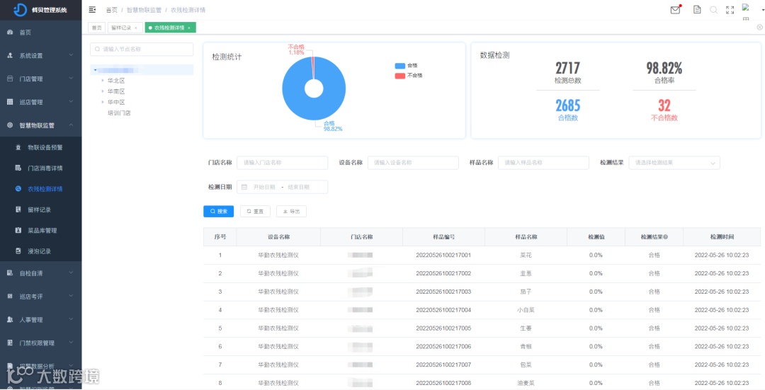 督贝督导食安管控平台“智慧监管”板块内容涵盖:设备状态、农残报告、留样记录、消毒记录、环境检测等信息关联登记功能,可督促团餐企业落实门店状态,生成溯源电子台账,从源头上把控食材品质,做到食品来源可追溯、去向可查证、责任可追究的有效措施。