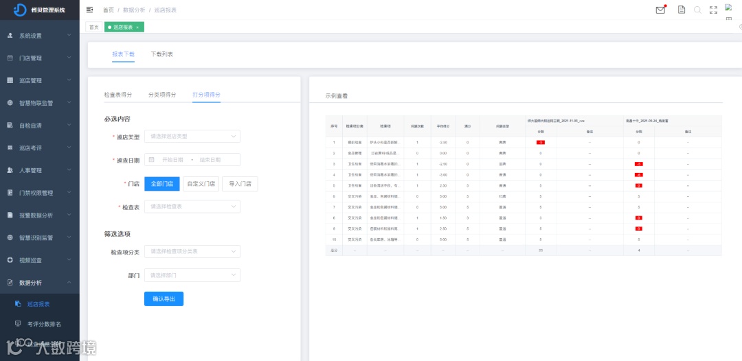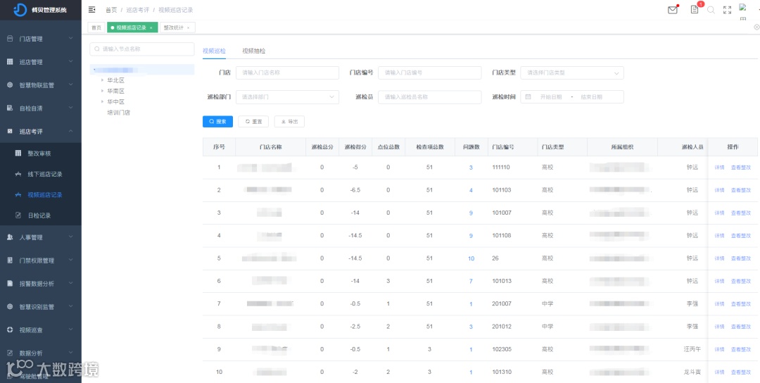 督贝督导食安管控平台“门店概览”板块内容涵盖:巡店统计、整改占比、日检进度、门店排名、报警统计、AI分析等功能,可针对企业各门店频发问题事故统计以及频发问题的排序呈现,并支持通过多维度条件筛选,以严谨的科学数据分析为管理层提供专业的决策支持。